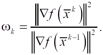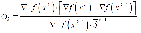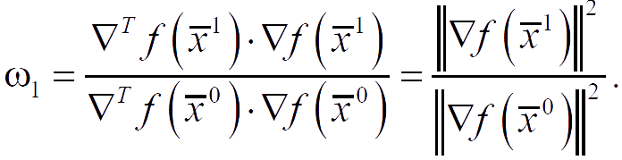 After n+1 iterations ( k = n), if the algorithm has not been stopped, the procedure is repeated cyclically with the replacement of x̅0 by x̅n+1 and return to the first point of the algorithm. If the initial function is quadratic, then the (n+1)-th approximation will give the extremum point of this function. The described algorithm with plotting of ωk using formulas corresponds to the Fletcher-Reeeves method of conjugate gradient.