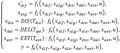 где DIS(Tdis) - оператор векторного покомпонентного дискретного запаздывания; Tdis - вектор соответствующих периодов дискретизации; DEL(Tdel), EXT(Text) - операторы покомпонентного запаздывания и экстраполяции; Tdel, Text - векторы соответствующих постоянных времени.