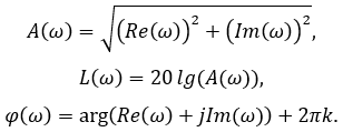 Значения амплитудной A(ω), логарифмической амплитудной L(ω) и фазовой j(ω) частотных характеристик вычисляются в виде: