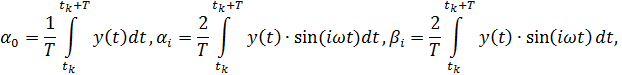 Интервал оценки АЧХ выбирается из расчета tk = kT, а значения характеристик оцениваются на каждом интервале [t1, t2], …, [tk, tk+1] до тех пор, пока разность оценок между соседними интервалами не будет удовлетворять заданной точности. Чтобы уменьшить время переходного процесса, на 1-м периоде [0, T] можно принять u(t) = at/T.