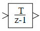 The block is used to perform integration in discrete systems. The expression T/(z-1) is used as an approximation of the transfer function 1/s. The calculation of the block output is based on the following expression: