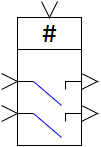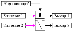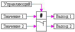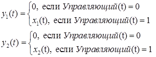 where x1(t), x2(t) are the input signals of the block (or signal vectors), y1(t), y2(t) are the output signals of the block (or signal vector). The control signal enters the unit from above. During the calculation process the block image changes depending on the presence of the control signal: in normal position the key is open, i.e. when the control signal is applied the key is closed: