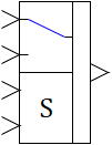 The block is a switch that connects one of the analog input signals (X1 or X2) to the output. The switching is controlled by two binary inputs (X3 and X4). The logic of the block operation for two input signals is presented in the table.