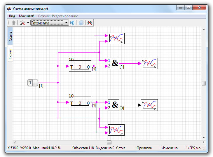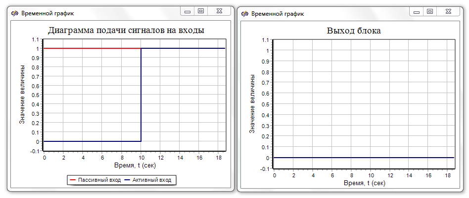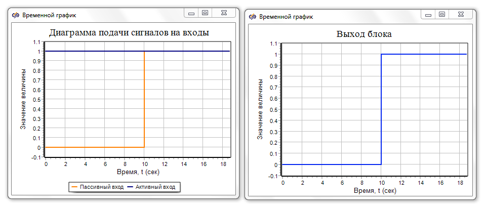 Let's assemble two diagrams, in one of which (on the boolean AND block with a passive input) a signal is transmitted first to the active input, then to the passive one. In is the second diagram, first the signal comes to the passive input, then to the active one.