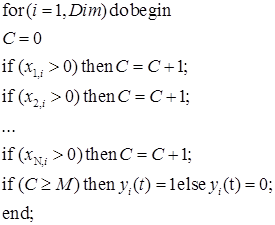 Thus, a logical 1 is formed at the output for each of i (for each of the signals in the input vectors) if C≥M (the number of non-zero i-th signals in the input vectors exceeds the parameter M). If C<M, the logical 0 is formed at the output (for each of the i-th elements).