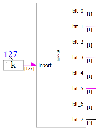 The block converts an integer in decimal form into a binary form of a given dimension. For example:
