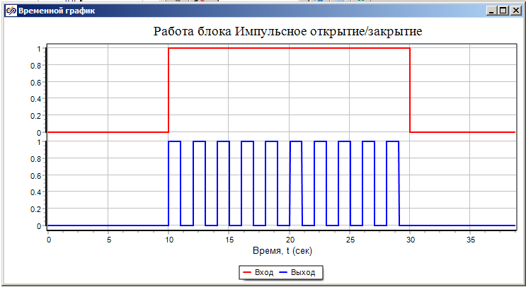 The block generates a pulse of the logical 1 at its output for as long as the logical 1 is received by the input. The pulse length and pause length are set in seconds in the block properties.
