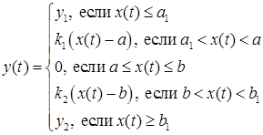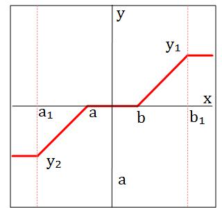 The block implements conversion of input signals by means of a single nonlinear static characteristic of the "Linear with saturation and deadband" type according to the following algorithm: