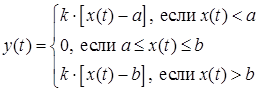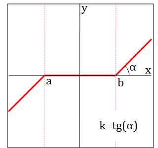 The block implements conversion of input signals by means of a single nonlinear static characteristic of the "Linear with deadband" type according to the following algorithm: