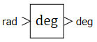 The block implements conversion from radians into degrees by the formula deg = rad ⋅ 180/Pi, where deg is the angle value in degrees, rad is the angle value in radians.