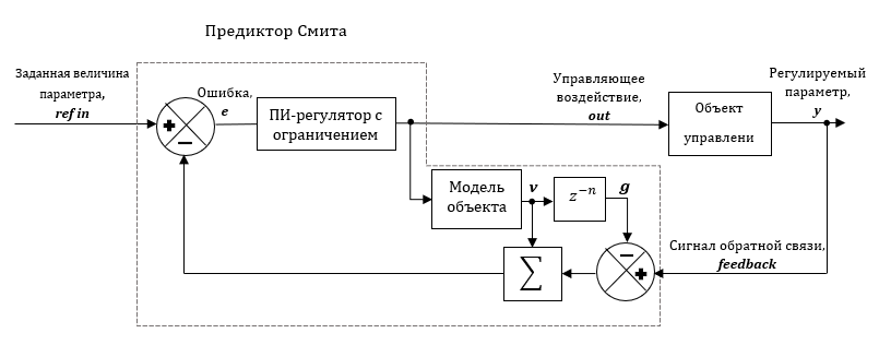 Рисунок 1. Structural diagram of the closed-loop system with Smith predictor.