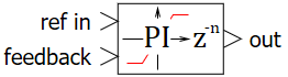 The output signal of the PI controller (port out of the block) is applied to the control object and to the internal model of the controller. The PI controller primarily controls the model, rather than the control object, through the summator. The signal g must match the measured signal of the regulated variable y. The y and g signals are compared to produce an error signal that includes errors from both the interference and the model. They are added to the v signal from the object model to feed the feedback signal to the PI controller block.