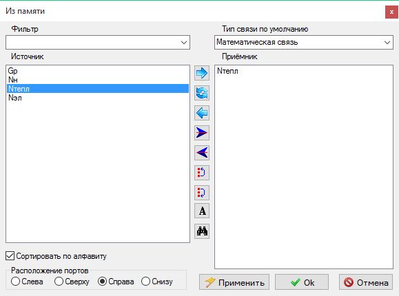 Прим.: if the number of global variables (scalar or vector) being extracted from dynamic memory is two or more, then when the dialog window is closed, the Schema window will be redrawn and this block from memory will have the number of output ports (scalar or vector) equal to the number of retrieved global variables.
