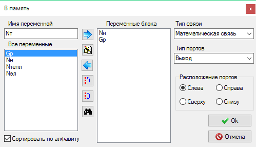 The block has a special dialog box containing the Name of a variable dialog box (for entering the name of the global variable) and the List of variables information box (for displaying the list of names of all global variables available in the project at the moment of opening the dialog box). By default, Y1 is entered in the line Name of a variable in the 1st block moved to the Schematic window. If you are satisfied with this name of the variable, clicking "Yes" will result in the formation of a global variable of the same name (scalar or vector according to the block input dimension) in the dynamic memory. If the default name (Y1) is left in the 1st "Into memory” block moved to the Schematic window, then when the dialog box of the 2nd "Into memory" block moved to the Schematic window is opened, the default name Y2 will be suggested, and the List of variables information box will contain 2 (two) names: Y1 and Y2. To create a connection point it is necessary to place the block on the schematic, connect to it a communication line containing the required signal and set a name for it. By default, the signal has the name "Y1". To change it, you must double-click on the block, enter the desired name in the "Signal name" field and move it to the Variables of the block field of the block using the Add a variablebutton. Each variable added there will correspond to an input port to which the communication line can be connected.