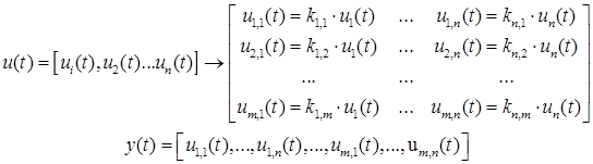 t)] is 2-core (N = 2). It is necessary to multiply this vector 3 times (M = 3), and the signal on the 1st "core" of the input vector must be amplified 2, 3 and 5 times, and the signal on the 2nd "core" of the input vector must be amplified 4, 2 and 7 times, respectively. Numerical form of setting the gain coefficients: [[2,3,5], [4,2,7]]. Then the output vector will have the value: