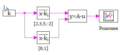 the result of multiplication is obvious: a column vector, the elements of which are 19 and 38. The figure below shows a structural diagram for solving this problem. Typical