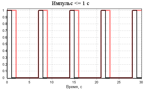 Let's consider three blocks with pulse durations not more than 1, 4 and 10 seconds. At the same time, the same signal of the "Square signal" type with a full period of 7 seconds (the duration of the first half-period is 2 s, the second half-period is 5 s) will be input to the blocks. The calculation time is 30 s: