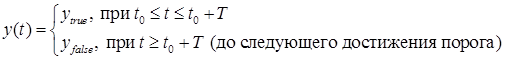 It generates a pulse with the value ytrue of a predetermined duration T when the input value changes to a predetermined threshold x0. Let us suppose that at some point in time t0 the input value has reached the threshold value: x(t0) ≥ x0 , and x(t0 – Δt) < x0 . Then at a later time: