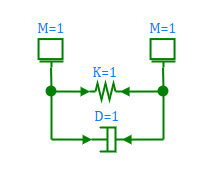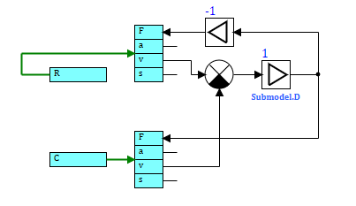 The block reads the values of linear speeds from each of its input mechanical ports "C" and "R", determines the value of the damping force and transmits it back to ports "C" and "R". At the same time, the values of the forces at different ports of these blocks have opposite signs in accordance with Newton's 3rd law. The spring model is similarly implemented.
