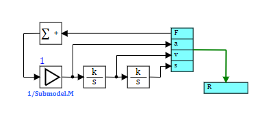 The block reads the values of the forces from the output mechanical port "R", sums them up and determines the acceleration, speed and coordinate of the body moving under the action of the total force. The calculated values are transmitted to the mechanical connection line.