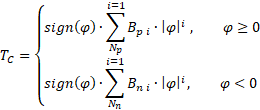 This method allows you to define the dependence of the torque on the turn angle separately for extension and compression. The polynomial Bp defines the dependence at a positive deformation value (extension) and the polynomial Bn defines the dependence at a negative deformation value (compression):