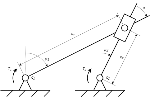 The block allows you to simulate mechanisms in which the fastening planes of the hinges C1 and C 2 are parallel or perpendicular (fastening to a vertical plane). The figure (Figure 1) shows a mechanism with a parallel arrangement of the hinge attachment planes. In case of arbitrary arrangement of the hinge attachment planes, this should be taken into account when determining the angle α.