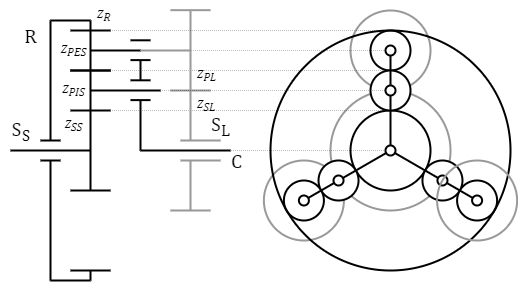 - Large and small sun gears SL and SS with tooth number ZSL and ZSS
